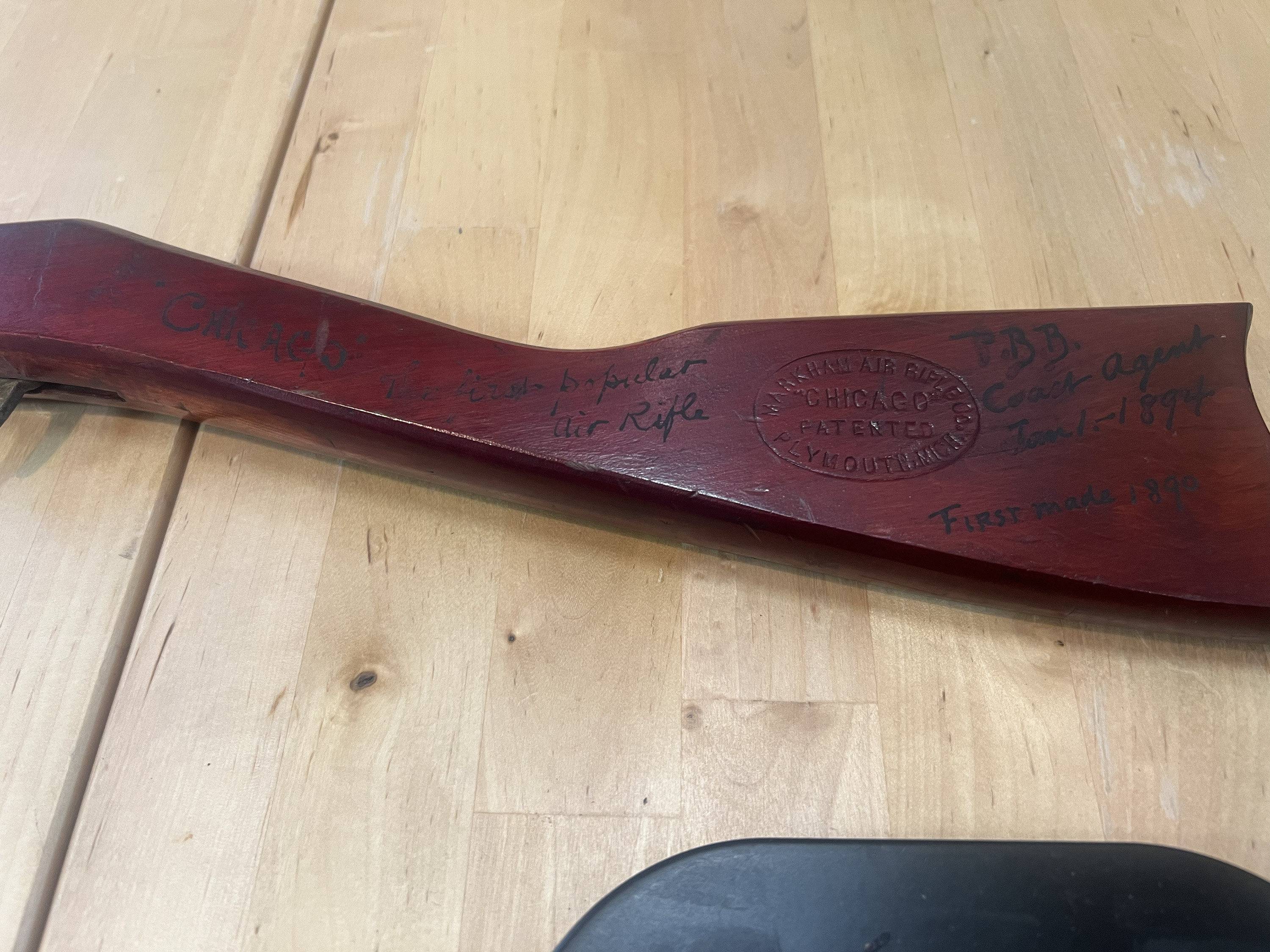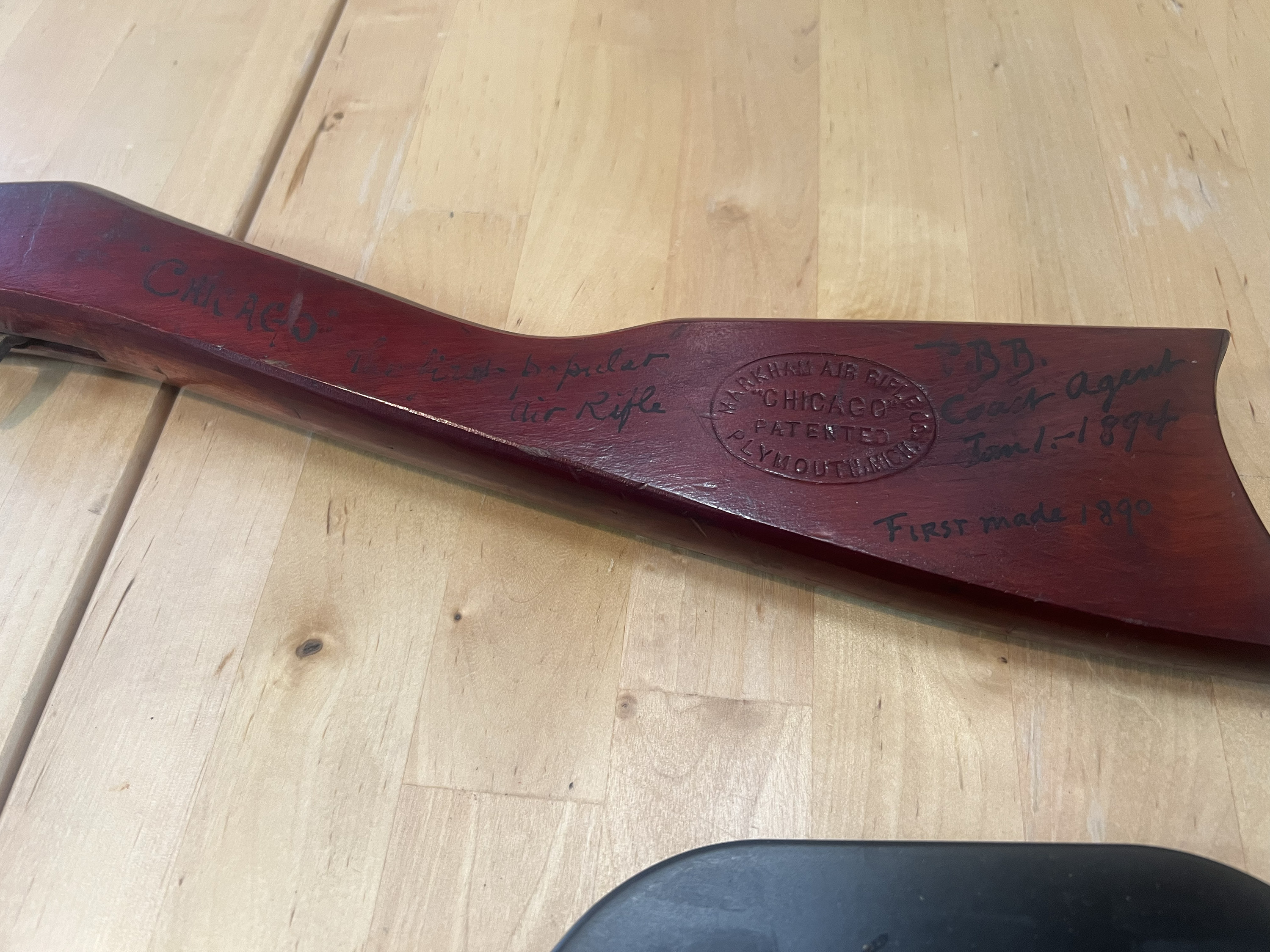 Caliber .176 (air rifle shot). Also shot darts. Maple stock and frame with rosewood stain. Stock stamped on left side with oval logo: Markham Air Rifle Company Plymouth, Michigan, Chicago, patented.